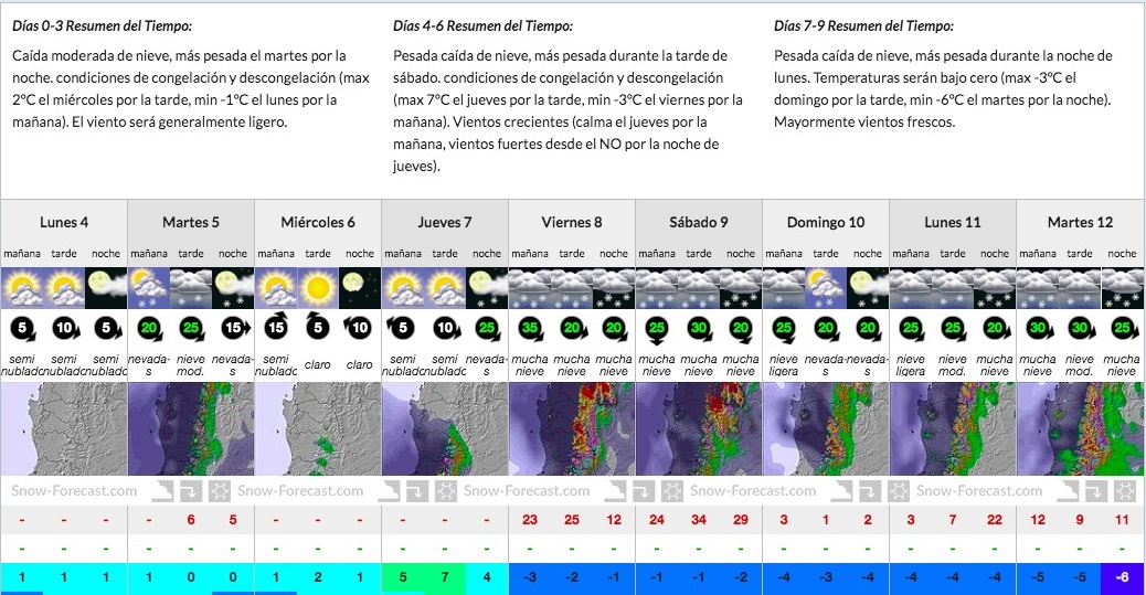 En a zona Centro Sur del país y el sitio Snow-forecast  pronostica la caída de más de 2 mts de nieve en centros de ski del sur, encabezados por Nevados de Chillán que podría recibir hasta 2, 28 mts de nieve, seguidos por Las Araucarias y Corralco también cercano a los 2 mts.
