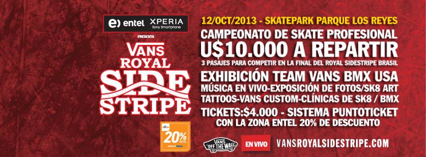 Todo esto tendrá lugar en el SkatePark del Parque los Reyes, donde habrá montado un escenario en el que tocarán grandes exponentes de la escena musical nacional, como BBS Paranoicos, Rosewell, Coffeehouse, Dj J-1 y Dj Dubless, además de bandas emergentes locales que están siendo seleccionadas en estos momentos. VANS en una marca que se caracteriza por englobar el deporte, la adrenalina, la cultura juvenil, la vida activa, la creatividad, invitándonos siempre a expresarnos de forma libre, es por esto que formando parte del Vans Royal SideStripe habrán diversos stands de creativos artistas nacionales exhibiendo sus trabajos en tablas pintadas, fotografías, tatuajes, intervención de zapatillas, concursos, premios y mucho más.Las entradas tienen un precio de $4.000 + recargo por servicio.